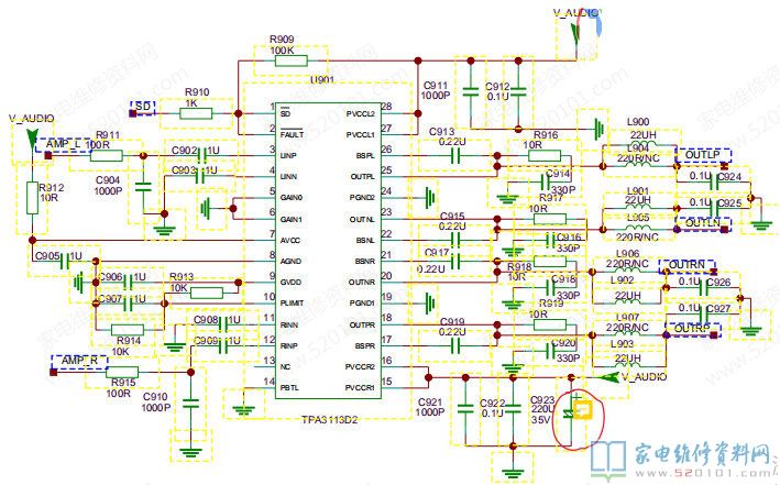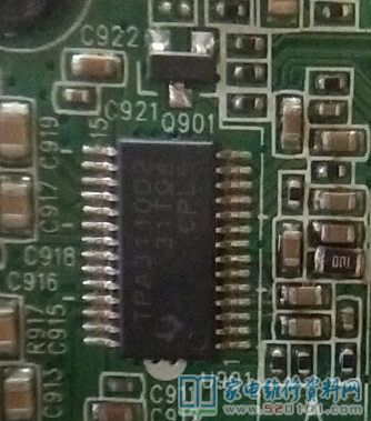 接修一台乐华LED42C830S液晶电视,故障表现为无伴音,拆开机器,首先查看伴音集成(U901:TPA3110D2)7脚AVCC限流电阻已烧黑。更换10欧贴片电阻伴音正常输出,用户拿回家使用一天后再次无伴音,在路检查出(R913R914)贴片电阻阻值不对,更换也没有输出,更换TPA3110D2两次后伴音变成了失真,查出供电电容(C923:35V220UF)容量变小只剩下(50UF),更换后正常。