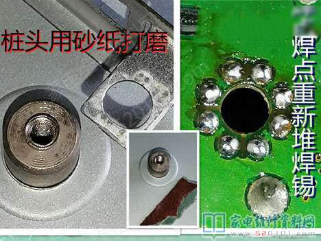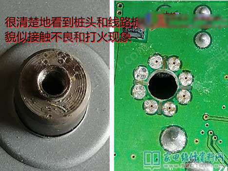 原来是主板和地脚连接点接触不良,很明显。还貌似又打火迹象。然后就对桩头砂纸打磨,板子接地点再用焊锡堆焊锡处理。