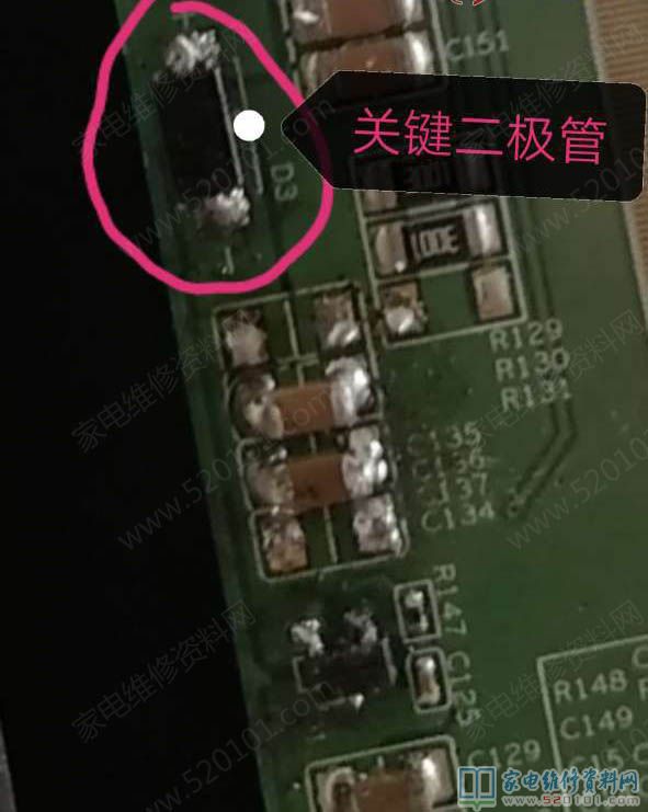 基本上可以判断为某处短路导致主控芯片短路保护,在主板上没有看见有元件外观异常,那么就从简单4开始——外围部件。当拔了屏线时主板所有电压正常了,终于确定了故障范围。由于逻辑板没有找到电路图,也不知道工作原理,一时间无从下手,花了几天时间找电路图,逛论坛学习师傅们的维修经验,终于找到一条信息,某个师傅也曾遇到过,就是把Q1三极管换掉,至于他是什么屏幕就不知道了,不管怎样试试就知道了,后来找到拆下,还是不行