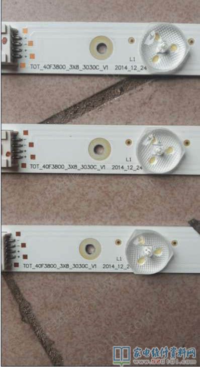黑屏后立即关机重启没出现图像,断电十几分钟再次开机,图像重现,十几分钟又黑屏,由此判断某原件热稳定性不好,液晶电视灯条坏的多,经验告诉我灯珠热稳定性不好,直接开屏取灯条,用点灯王直接点灯,开始灯全亮,几分钟后三分之一灯珠由亮变暗,直至灯灭,故障由此判断为灯条坏,跟用户商议等件三天,今天正好三天,货到,一个半小时换灯条完工,试机三小时不再出现问题,用户取走,此次维修不含任何技术含量,全凭经验,没有动用万用表,就是开屏有一定的风险。
