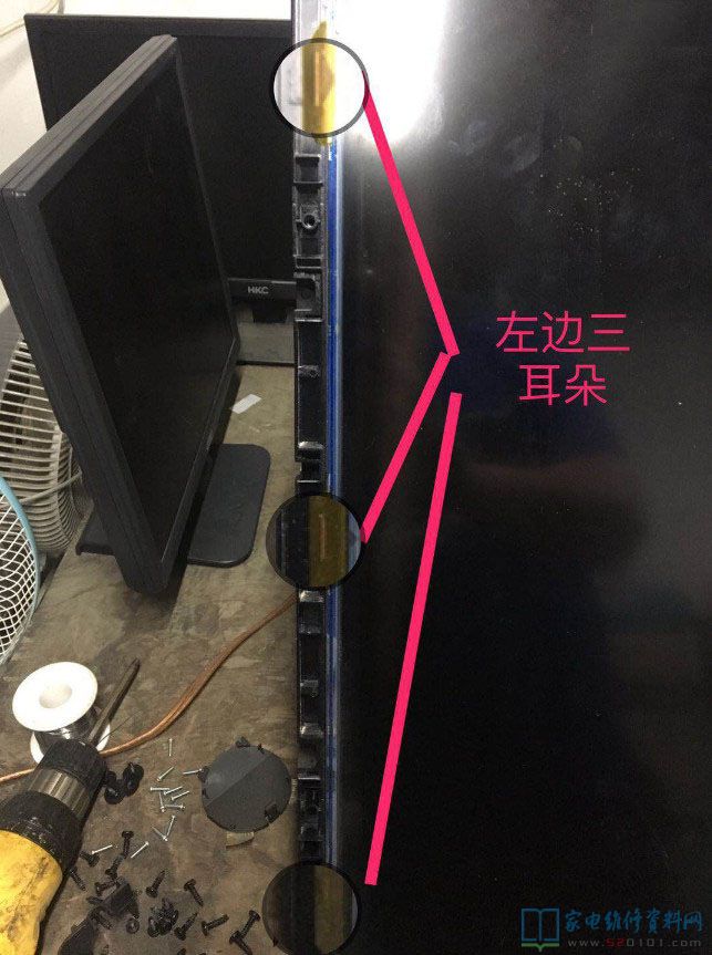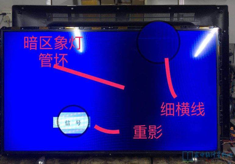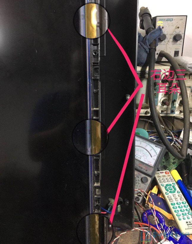 刚开始想弃修,又是屏又是灯管的,不合算,仔细一想放久了会正常,屏坏也会这样黑带,找空点的时间来玩玩。次日,分析看来是和屏有关,不象是逻辑板故障,于是拆机,拆边框,仔细检查边条,发现边条都有点弓想来的样子,用手轻轻一点,屏上竞然就完全好了,好开森啊,这下有戏了, 松开固定的螺丝,边条也就没那么弯了,图像完全正常。