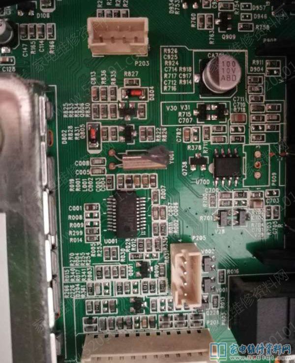 重点检查保护电路,如下图所示,U001第16脚为保护脚,开机测其电压在2V左右大幅波动,显然故障就在周围,一眼就发现了大家喜爱的发财胶,此胶是用来固定晶振Y001的,但覆盖住了Q805和Q806所在面积的一系列元件。而U001的16脚通过R007正是通往了“发财胶”下面。不用多想,直接铲除胶体吧,小心去除胶,再用酒精清洗一遍,吹干。再上电试机,16脚电压已恢复至3.8V以上,电视也不再自动关机,试机半天装壳完工。
