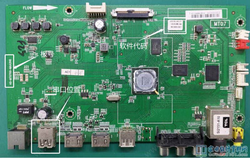 接下来再看一下MTK芯片方案的特点,印制板上有个MT07的标识,MT代表的就是MTK芯片方案,07就是芯片型号为MT5507的意思,板号跟软件代码以及串口位置跟Mstar芯片方案一样,如图6所示。
