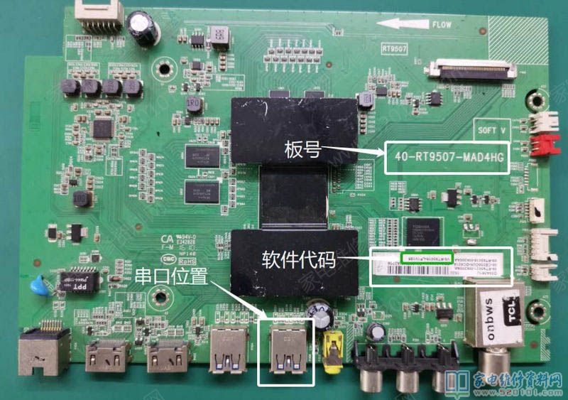 RTD芯片方案的印制板上印有RT9507的标识,RT代表的是RTD芯片方案,95就是芯片型号为RTD2995的意思,板号跟软件代码以及串口位置跟Mstar芯片方案一样,如图7所示。