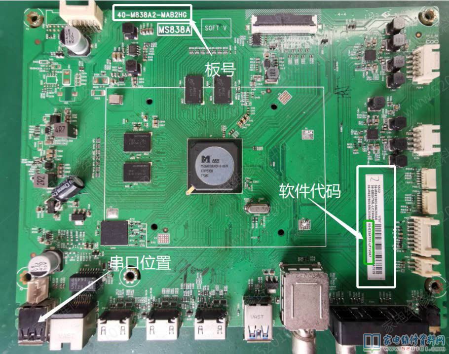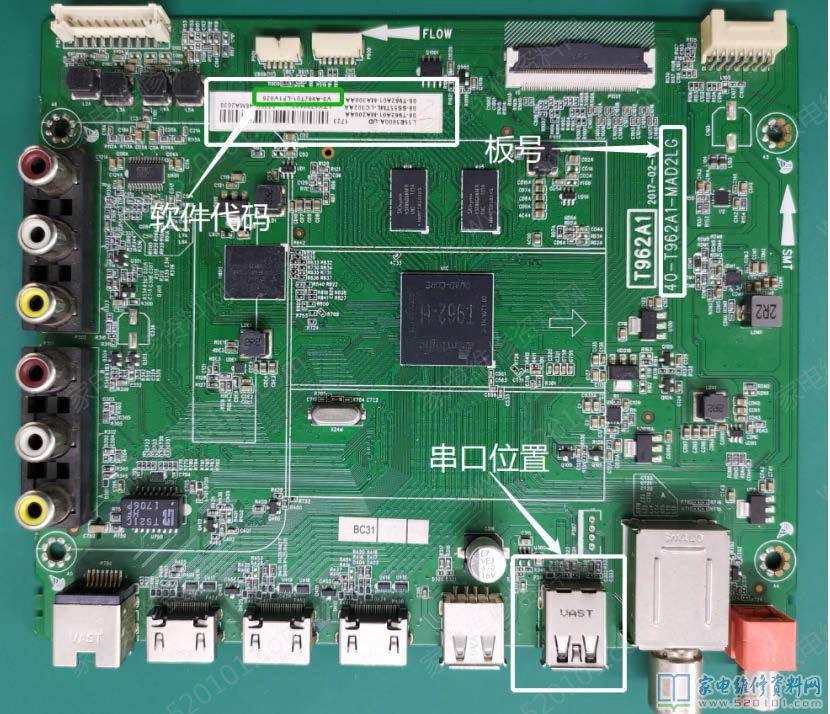 Amlogic芯片方案的印制板上印有T962A1的标识,T代表的是Amlogic芯片方案,962就是芯片型号为T962的意思,板号跟软件代码以及串口位置跟Mstar芯片方案一样,如图8所示。