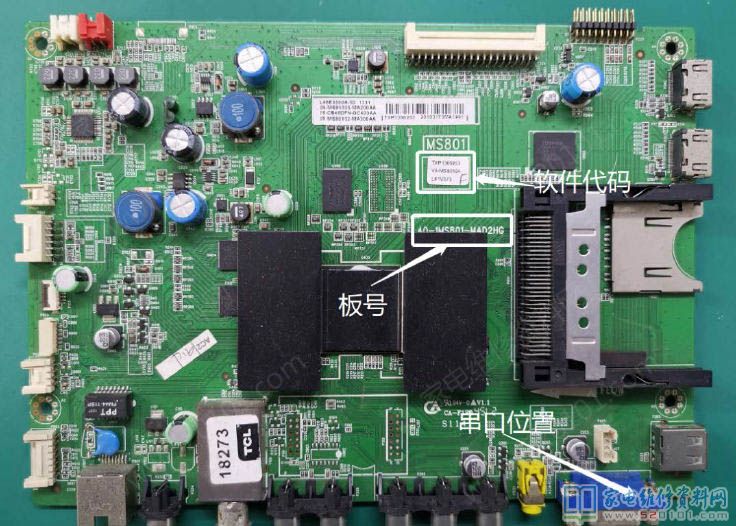 TCL早期的主板,一般来说,板号都会直接印刷在印制板上,而软件状态会有专门的白色纸条说明,比如图1.1这张主板拿到手里,我们基本就会有一个大致信息的掌握,印制板上有MS801的标识,说明此板用的Mstar芯片方案,MS801代表主芯片型号为MSD6A801。