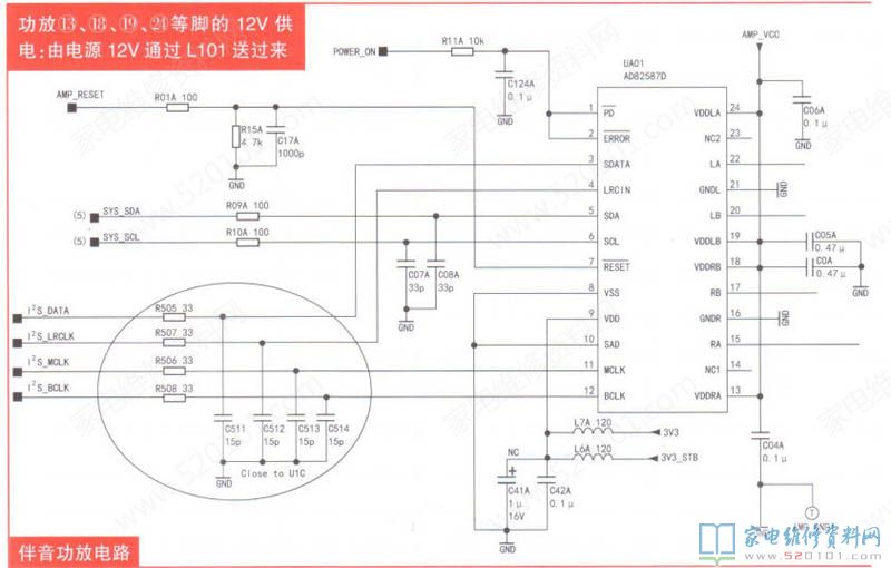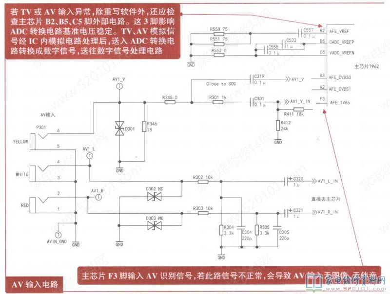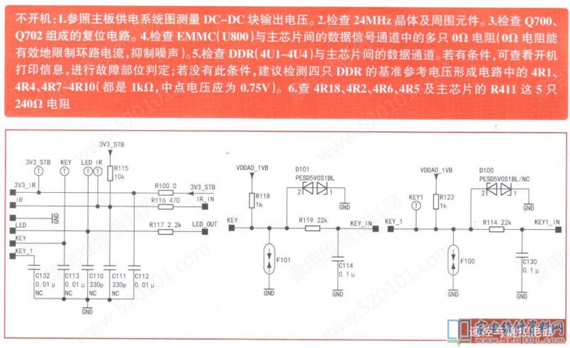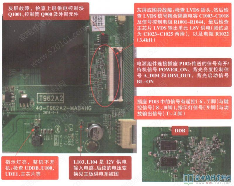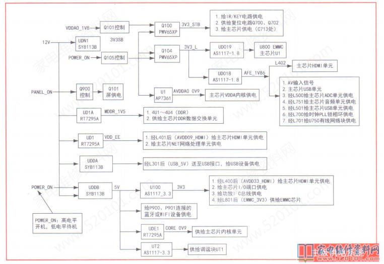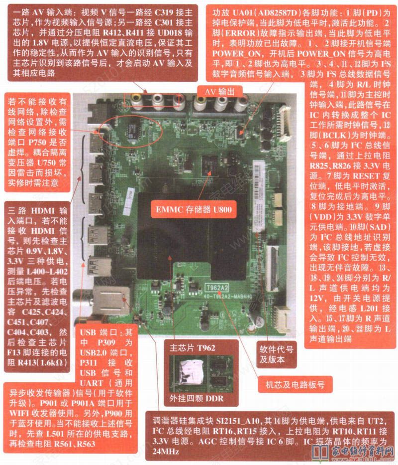 TCL T962A2机芯液晶电视主板维修图解 2021-11-20 20:05:53 阅读 806 次 评论 0 条 摘要: TCL L55P2-UD、L50P2-UD、D55A630U、Y65A690、D49A63、55A660U等型液晶彩电采用 T962A2机芯,电路板号为40-T962A2-MAB4HG,主芯片采用晶辰芯片T96 TCL L55P2-UD、L50P2-UD、D55A630U、Y65A690、D49A63、55A660U等型液晶彩电采用 T962A2机芯,电路板号为40-T962A2-MAB4HG,主芯片采用晶辰芯片T962,调谐块采用SI2151,四块数据交换缓存器DDR采用H5TQ4G63CFR,伴音功放采用AD82578D。 伴音功放电路 AV输入电路 主板供电电路 版权声明:本文为转载文章,版权归原作者所有,欢迎分享本文,转载请保留出处! 点赞 分享: PREVIOUS:HKC牌F43DB5100液晶电视不开机的故障维修 NEXT:用强刷机方法修复长虹LED55C2000i液晶电视反复自动重启故障 文章导航