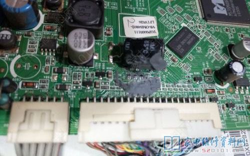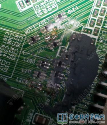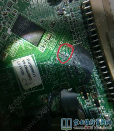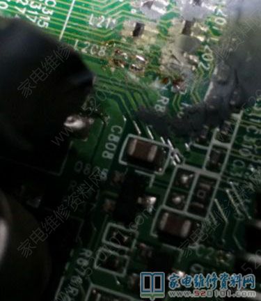 接修一台TCL王牌液晶电视,型号是L40F11,故障现象为灰屏。拆机通电试机测逻辑板上电压基本正常。测屏线各组电压发现有2组数据线没有电压,顺藤摸瓜至主板发现有只躺着的电容C816被大量的胶粘着,胶下面有10只连接屏线的电感,看到这一幕心中暗喜难道又是传说中的发财胶?用牙签清理了一下,测量发现L204、L208不通,用细铜丝连接上通电试机,红色的TCL LOGO显示在屏幕上了,故障修复。