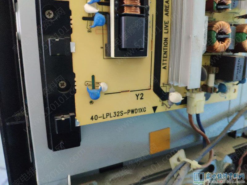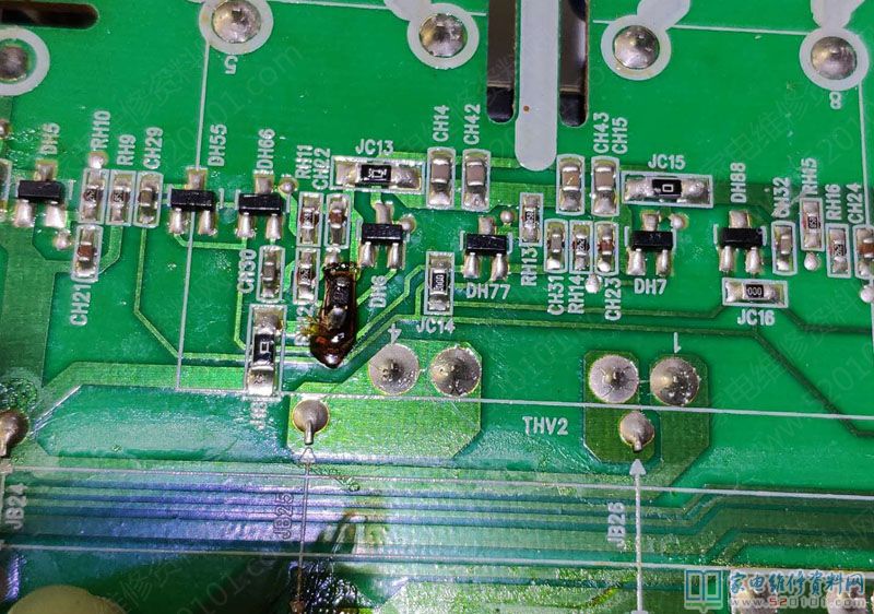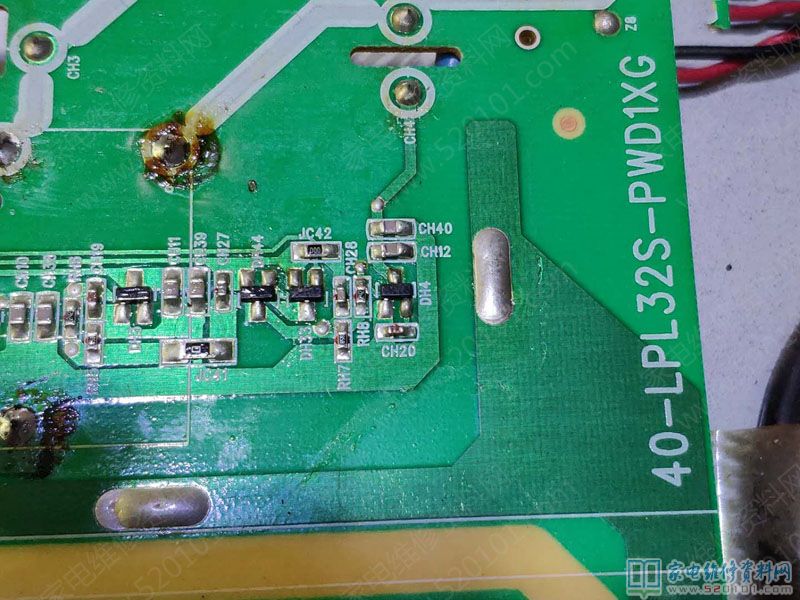 接修一台TCL L32M9B液晶电视,本来原来故障是放1小时左右关机,结果昨天拿来我也试过,可以开机,今天开机发现电源指示灯闪烁,开不了机,反复多次也无法开机,于是拆机检查,发现电源12V正常(40-LPL32S-PWD1XG),电源板背光检测芯片过一会来回闪烁,因为开机背光不亮于是检查背光高压变压器次级电压,发现有两组开机瞬间电压很低后来没有了,有两组电压高,保持一会也消失了,这个时候一直没有发现屏幕点亮,结果我在测试高压变压器电阻过程中,发现右边高压变压器最右边那个脚对地阻值有3欧,结果顺路清理过去,发现图片JC11有3欧电阻,换后开机背光点亮。试机两天没有任何问题,交付给用户使用。
