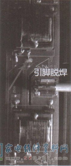 一台TCL L40P60FBD电视,开机后有声音,无图像;用手电筒照液晶屏,可以隐约看到图像。拆机,测量电源板与主板连接的排线插座中的背光使能端电压,开机后该端电压为3.3V,同时听到电源板.上升压变压器有轻微的“咝咝”工作声;十几秒后,背光使能端电压降为0V,升压变压器也不再有响声。根据经验,是背光电路启动后又随即进入了保护状态。检测高压电容C501 ~C505,均正常。该机将背光升压驱动芯片OZ9976①脚(TIMER)接地(关闭保护功能),开机后背光使能端电压一直为3.3V,且升压变压器持续发出轻微的“咝咝"工作声,由此判断背光升压电路工作正常,故障原因是灯管异常。拆开液晶屏,发现灯板上有10个小变压器,对应驱动10根灯管。经查小变压器T508初级一个引脚脱焊,如图1所示。