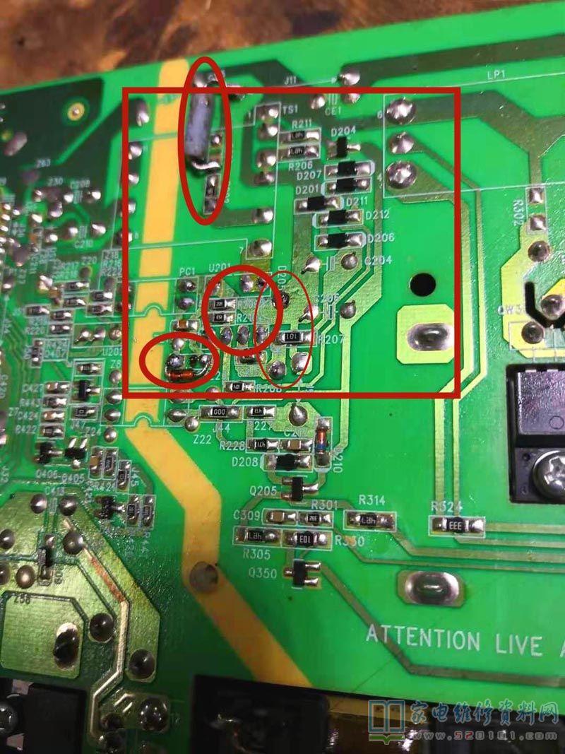 接修一台TCL L46E5300D液晶电视,故障表现为开机无反应。拆机,其电源板采用的是40-E371C4-PWH1XG(电路图),早期的TCL、三洋、东芝、先锋液晶电视,很多机型都用这种型号。检查发现无3.3V电压。测量整流,负载正常。问题重点换在电源管理芯片LIPER17L范围内,发现D205稳压管(18V),D203(6.8V)都击穿。LIPE17L也坏。三者都换,还是不行,输出电压只有0.几伏,在查发现贴片电阻R201、R202(4.7欧),均己损坏,用换大镜在旧板瞄了老半天,才从旧板上找到一个4R7的贴片。