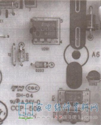 更换U201后通电试机, 电源指示灯亮,按下“待机”键,光栅出现,故障排除。