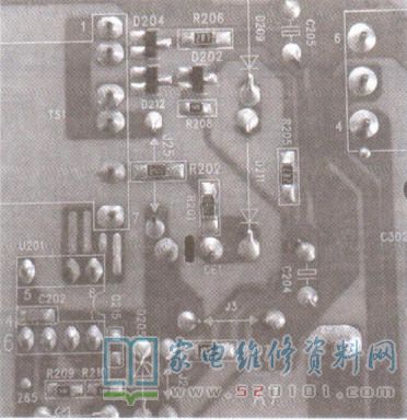 接修一台TCL L39E5090J-3D型液晶电视,上电后指示灯不亮,不开机。拆开机壳,检测电源板(板号:40-E371C6-PWG1XG)上保险丝F1(3.15A/250V)正常,主滤波电容CE2、CE3 (均为47pF/450V )引脚充放电也正常。上电测量,CE2、CE3两端电压为300V,但开关电源次级无3.3V电压输出。断电检测,发现贴片电阻R201(2.72)和R202(2.792)表面烧焦(见图1),稳压二极管D203 (PH.C18 )和D205(PH.C18)均已击穿。