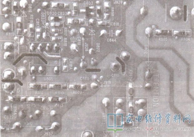 接修一台TCL L46F11型液晶电视,上电后电源指示灯不亮,不开机。拆开机壳,检测电源二合一板(板号:40-1PL47L -PWLIXG(40-1PL46A-PW1XG))上保险丝F801 (5A/250V) 正常,主滤波电容C811、C812(均为82pF/450V )充放电也正常。观察电源板背面元件,发现电源芯片U801外围的贴片电阻R804(2.7Ω)、R805(2.7Ω)、R813 (2.2Ω)、R814(2.2Ω)、R814A (2.2Ω)表面烧焦(见图);拆下测试,均开路损坏,怀疑电源集成块U801也已损坏。