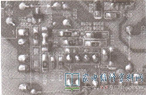 断电,取下电源板检查,发现贴片电阻R201、R202(均为2.72 )表面烧焦。由于这两只电阻是电源集成块U201(VIPer17L )的供电电阻,所以怀疑U201短路。在路测得U201①脚(GND)与⑦、⑧脚(vcc间的阻值很小,由此判断U201短路。更换R201.R202、U201后试机,故障依旧。检查U201外围电路,发现贴片电阻R208(4702)开路, 如图1所示。更换R208后试机,图像、伴音均正常,故障排除。
