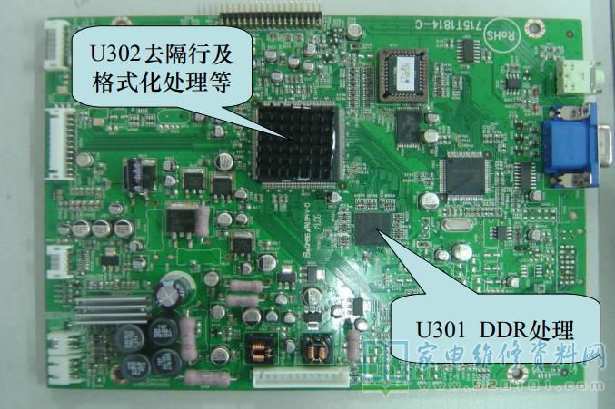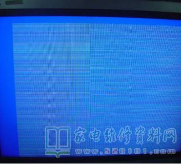 针对细竖条干扰,故障为U301与U302相互处理的数据信号MD0—31其中一路或两路丢失,此时可逐一测试其数据波形,若发现某一路无波形,可再测其电压,通常异常时电压为2.5V左右,此时我们需判定是U301坏还是U302坏,不要盲目的更换IC,只需将数据传输排阻断开后测量其两端电压,有一端肯定为0.5-1.2V(正常),另一端肯定为2.5V(异常),与该端连接的IC即为不良将其更换后即可解决。