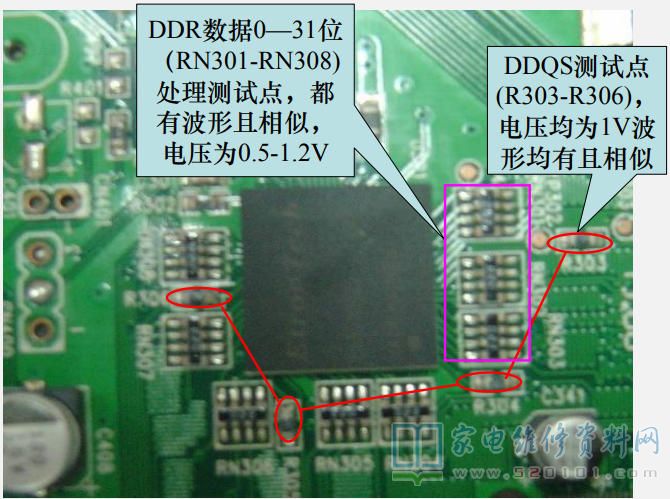针对满屏密竖条干扰,故障为U301与U302相互处理的数据存储信号DQS0-3其中一路异常,因每一路DQS控制8位的数据处理,同样可测试其波形与电压判定,正常