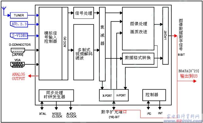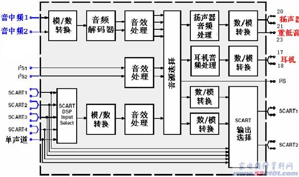 MSP3410G芯片还接收来自SIL9021的HDMI音频I2S总线信号,来自音频转换器的信号,AV1-AUDIO信号,AV2-AUDIO信号,AV3-AUDIO信号。由于这些信号不含NICAM-728数码,因而也无需进行丽音解码。这些信号先经过输入选择,然后经模/数变换器变换成数字信号,再进行数字式音效处理。