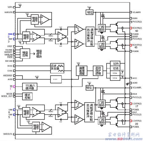 直流电压控制立体声扬声器的音量范围在-40dB到36dB的幅度,输出到耳机也可以由直流电压控制在-56dB到20dB的增益范围。