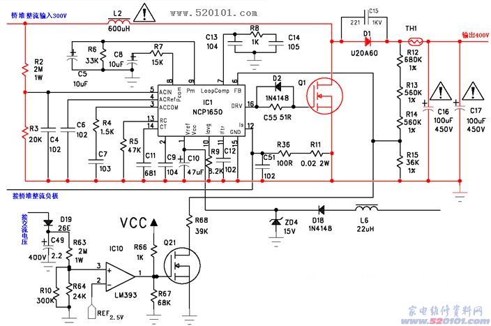 功率因素校正PFC(Power Factor Correction)电路主要由NCP1650芯片及L2、Q1、D1组成。这是一个高频有源PFC电路,NCP1650根据⑤脚输入的交流采样电压和⑥脚输入的反馈电压,产生PWM驱动信号,控制开关管Q1导通与截止。当开关管Q1导通时,二极管D1截止,开关管Q1截止时,二极管D1导通。二极管导通时,电流向C16、C17充电,在交流电压半个周期内,电感L2的高频振荡电流频率是不断变化的,但峰值电流的包络曲线时刻跟踪交流电压的变化,L2的平均电流在开关周期很少时接近于正弦波,功率因素一般能提高到0.99。
