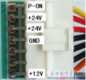 检查电源板是否正常工作,主要是测量输出电压是否正常。输出接口共有7根线,如左图所示。其中橙色引线输出+12V电压,两根红色引线均输出+24V电压,黑色引线接地。黄色引线是P-ON控制,当P-ON为低电平时,+24V开关电源不工作;当P-ON为低电平时,+24V开关电源正常工作。