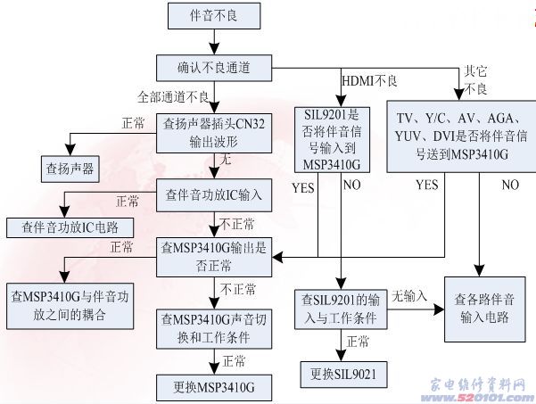 1)确认伴音不良通道。与图像不良检查类似,先确认伴音不良通道。若全部通道不良,则应检查9种信号输入经过的公共伴音通道,但从扬声器、功放开始检查;若个别通道不良,则检查相应信号通道,如DVI、HDMI信号输入时图像不良,则检查SIL9021电路。