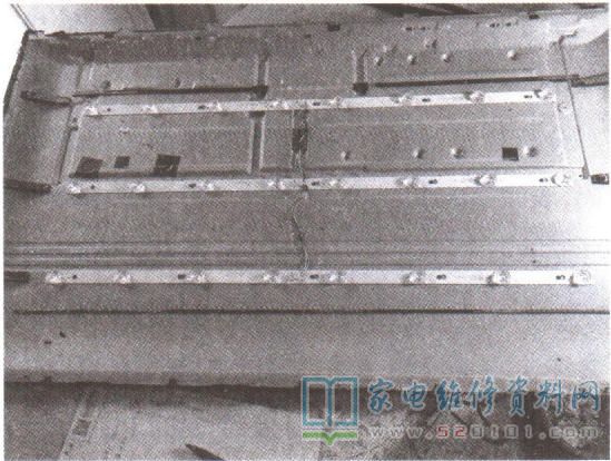 接修一台TCL L40F1B型液晶彩电,故障表现为开机后黑屏,伴音正常。拆机检查,该机背光插座CNB801中有两组LED灯串线,分别是红、黑线与白、黄线。在二次开机时,测得每组线之间的电压约为100V, 随后迅速下降。用点灯器检测两组灯条,均呈开路状态,由此判断屏内LED灯串开路。小心翼翼地拆开液晶屏,发现屏内共有3根灯条,每根灯条由两段组成,每段灯条上有4只灯珠,如图1所示。