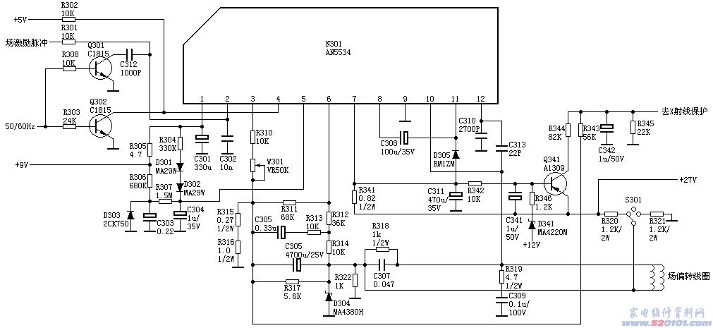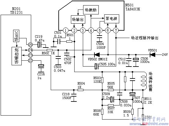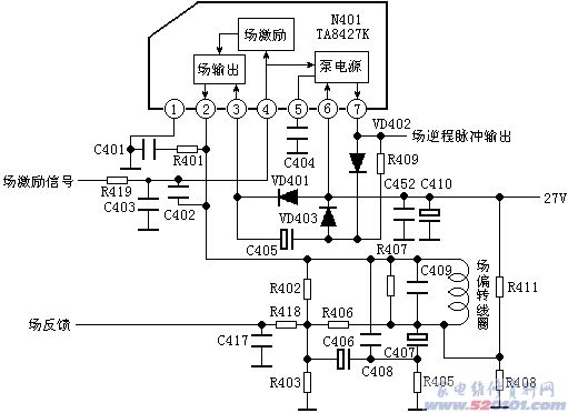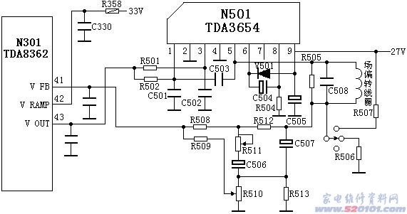 TDA3654采用泵电源供电,泵电源从(6)脚输入,V501为整流二极管,C504为泵电容。(9)脚为TDA3654的电源脚,正常工作时为27V。