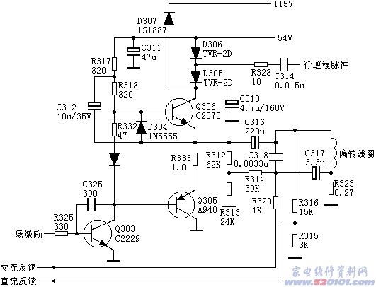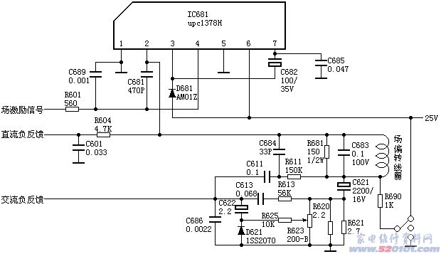 该OTL分立元件组成的场输出电路,在各种品牌机上有着广泛的应用(一般用在25或25寸以下机器中),尽管电路位号不尽相同,但电路程式是完全相同的,在维修时可作参考。