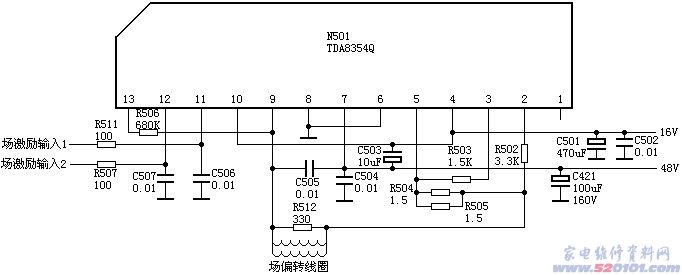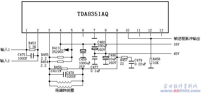 TDA8351AQ和TDA8351Q是不同的,两者引脚数不一样,TDA8351Q为9脚,而TDA8351AQ为13脚,不能互换。该电路摘自金星C8602
