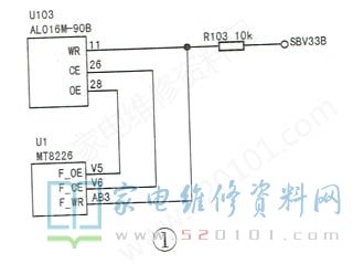 接修一台TCL L52X9FDM液晶电视,红色待机指示灯亮,不开机。经查,5V_ STB待机电压正常,但主板.上无+12V电压,表明主开关电源没有工作。测主芯片U1(MT8226)的AJ2脚(开/待机端)没有低电平开机信号输出。接下来查U1内嵌CPU电源、时钟电路、复位电路,未发现异常。考虑到FLASH存储器U103(AL016M-90B)工作异常会导致不开机,于是对U103的外围电路进行检查,发现U103 11脚(WR)与SBV33B电源相连的电阻R103虚焊,相关电路如图1所示。