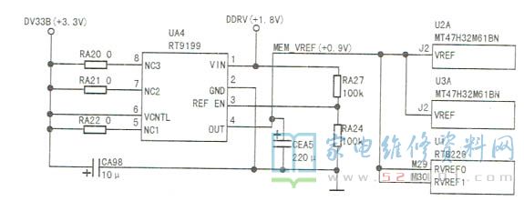 接下来检查主芯片U1中的DDR缓存器测得U1的DDRV端供电电压正常,但U1的M29(RVREF0)、M30(RVREF1)端的0.9V基准电压却为0V。
