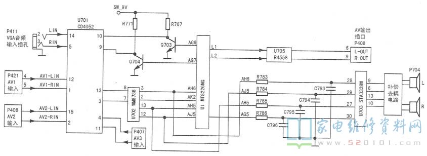 接修一台TCL L42M71D液晶电视(MT26机芯),除TV状态外,其他信号均无声音。从故障现象分析,此故障是外部音频信号输入切换电路异常所致。相关电路主要由U701 (CD4052、双路四选一开关)、U702(WM8738、双路音频A/D转换IC)等组成,如图所示。
