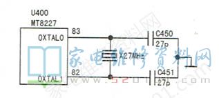 接修一台TCL L43F3310B型液晶电视(MT27机芯),图像彩色异常,类似CRT彩电磁化后的现象。怀疑DDR存储器供电异常,经查供电无异常。以为软件问题,对其程序升级后试机,故障现象不变。接下来,怀疑显示屏有问题,但换另一正常屏试机,故障依旧。正一筹莫展时,突然想起CRT彩电的彩色不正常与色副载波的频率(3.58MHz或4.43MHz)有关。虽然液晶彩电中没有色副载波振荡电路,但机器内部对图像信号的变换处理可能与某个频率有关。通过观察,主芯片U400旁边的27MHz晶振(相关电路见下图)值得怀疑,将其换新后接上信号试机,图像恢复正常,故障排除。