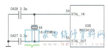 接修一台TCL 40A71-P型液晶彩电,无伴音,拆机将万用表置于RX1挡,用两表笔碰触立体声解码电路U38( MSP3410G)的信号输出端20、21脚,扬声器发出“喀、喀"声。从U38的耳机信号输出端17、18脚取出音频信号,注入接音频信号输入端44、45脚,无声音,显然故障在U38电路中。测量U38的+5V及+8V供电均正常,接下来检查U38的 54、55脚外接晶振电路(如图所示),发现X6(18.433MHz)一只引脚虚焊,将其焊好后试机,故障排除。