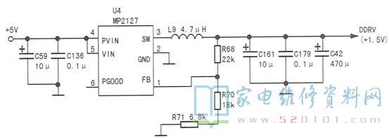 打印信息“DRAM loader config failed!!' 提示DDR存储器工作异常。首先测量DDR存储器(K4B2G1646C)的DDRV(+1.5V)供电,竟不足1V。DDRV(+1.5V)电压是+5V电压经DC-DC 转换器U4(MP2127)转换获得,如图2所示。