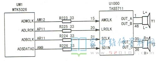 接修一台TCL L55V7300A-3D型液晶电视(MT36机芯),故障表现为无声音。首先试用多种信号源试机,均无伴音,怀疑软件有问题,但升级软件后故障依旧。测量音频功放U100(TAS5711)的供电、总线、复位、静音等端子电压,未发现异常。接下来测量U1000的四个信号输入端电压,相关电路如图所示,发现15脚(AMCLK)的信号电压为0V。