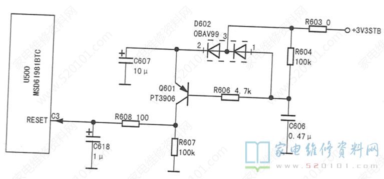 开机时, +3V3STB待机电压一路经D602③、②脚对电容C607充电,同时加至开关管Q601 e极;另一路经电阻R604对电容C606充电。当Q601的e、b极间电压高于0.7V时,Q601导通,c极呈高电平,即U500的C3脚为高电平。C606 充电电压通过R606加至Q601的b极,Q601的b极电位升高,当Q601的e、b极间电压低于0.7V时,Q601截止,复位过程结束。对上述电路进行检查,发现限流电阻R604已开路,换新后试机,故障排除。