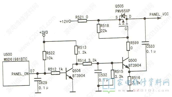 接修一台TCL L48E5020-3D液晶电视(MS28L机芯),故障表现为灰屏。上电试机,背光亮,说明逻辑板可能未工作。查上屏电压(+12V )只有+5V,说明判断正常。本机上屏电压控制电路由Q506、Q500、Q505等构成,如图所示。开机后U500的D7端(PANEL_ ON )输出低电平,Q506截止->Q500导通->Q505导通,S极输出+12V电压。手摸Q505感觉烫手,测量Q505的D、S极电流不足200mA,说明后级负载并无过流现象,判断Q505有问题。更换Q505后试机,故障排除。
