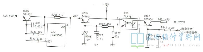 接下来对主电源的输入、PFC、LLC电路进行检查,发现LLC电路控制芯片U401(FSF1700 )电源端⑦脚电压为0V。该脚电压由Q207 e极提供,如下图所示。按下二次“开机”键后,Q407导通->光耦PC3③、④脚导通->Q205导通->Q207导通->Q207的e极输出约+17V电压加至U401的⑦脚。经查,限流电阻R305一端虚焊,补焊后试机,故障排除。