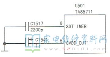接修一台TCL L46V6200DEG型液晶彩电(MS48IS机芯),故障表现为无声音。试输入其他信号源试机,还是无声,看来音频电路有问题。上电,测数字音频功放U501(TAS5711)供电正常,扬声器及音频输出电路也无问题;用示波器测量U501的信号输入端15、20~22脚的四组输入信号波形,正常。更换U501后试机,故障依旧。接下来在用万用表测量U501各脚电压时,发现只要表笔接触U501⑥脚,声音就正常。检查该脚外围电路,如图所示,发现C1517的容量已不足100pF,换新C1517后试机,故障排除。