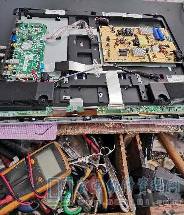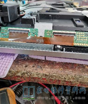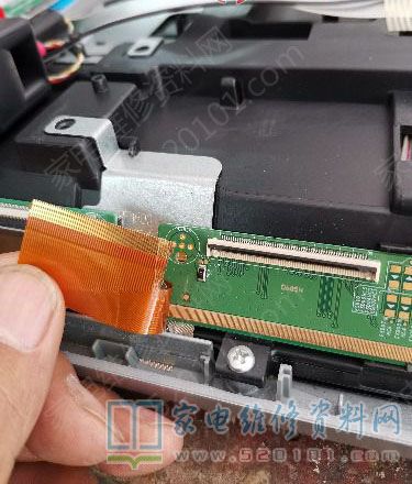 接修一台TCL L39F1600E液晶电视,故障表现为开机正常,15分钟发热后,图像间隔几秒钟画面抖动,看字符更明显。开壳热机查各电源电压基本正常,检查排线无果。想到以前修热机抖动通过隔离排线修复方法,也试一试,这台电视没有逻辑板,主板一条排线直接进右边板,右边板又有一排线到左边板,首先减下几毫米的透明胶带,分别隔离主板出来的排线一段一段的试机无果。