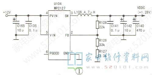 接修一台TCL L42F3300B型机(MS82T机芯),按下二次开机键,红色待机指示灯闪烁一段时间后点亮,但不开机。经查,主板上的插座P100 10脚已输出正常的开机高电平,P100①脚的+24V主电压和⑦脚的+3.3VSTB待机电压,以及U500 39、71、163、198脚的+3.3VSTB 电压及时钟振荡端69、70脚振荡波形均正常,且U500的①脚也有正常的复位高电平出现,但U500 24、32、123、133脚内核VDDC( +1.28V )供电为0V。该+1.28V电压是+12V电压经DC/DC转换块U104 (MP2127)降压转换而来,如图1所示。测U104④、⑤脚的+12V输入电压正常,但输出端③脚电压却为0V。查输出端并没有短路现象,接下来检测U104外围元件,发现滤波电感L106(4.7uH)一端虚焊。将其补焊后试机,故障排除。