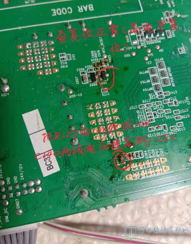 通过测量说明主板已经发出开机信号,但没有发出背光开启电压和上屏电压,应该是徦开机,主板应该有问题,但主板的各电压基本正常啊。什么原因呢?网上看了一下,说这个机型有通病,启动困难,有技改,就是在C140两端并个4.7欧电阻,C140两端电压也就是主芯片内核电压,一般是1.2V-1.25V,本机测1.18V,感觉偏低,赶紧找个电阻并上,上电开机,还是指示灯闪下就灭,没有动静了。测C140电压还是1.18V,看来没效果。心想如果把这个电压提高能不能开机呢,查资料把电阻R127由原来的12K换成10K,C140两端电压就升高到1.25V,但上电还是一样,“涛声依旧”。