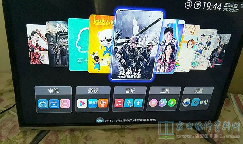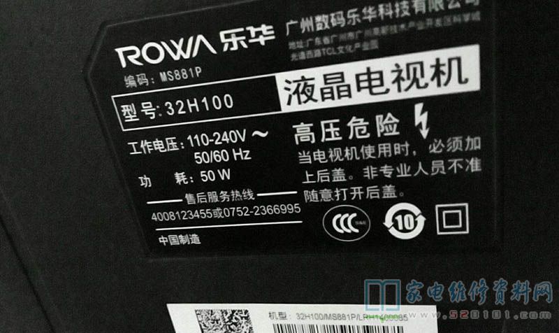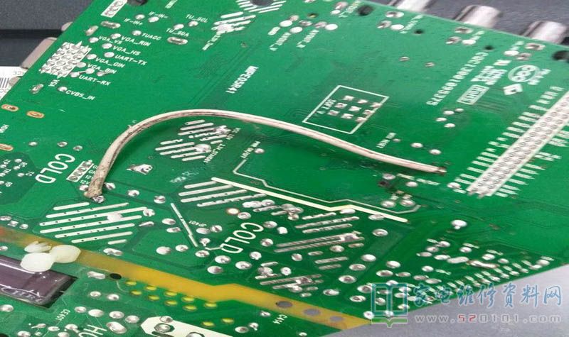 心中有数后,首先清理烧焦部分,测5V、12V对地阻值基本正常,然后从电源12V飞线到边板VCC,仔细检查无误,通电按下开键,乐华的开机LOGO图像出现,插上高清信号,图像正常。