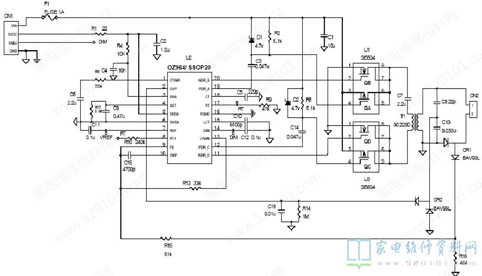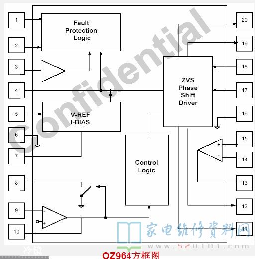 OZ964是O2Micro公司的一片专用于背光控制的高效率零电压切换的DC-AC转换IC,具有很宽的输入电压范围和固定的运行频率,其亮度控制可用一个模拟的电压或低频的脉冲宽度调制(PWM)信号控制。内置灯管开路保护、过压保护、欠压切断保护等。OZ964采用20脚SSOP封装。