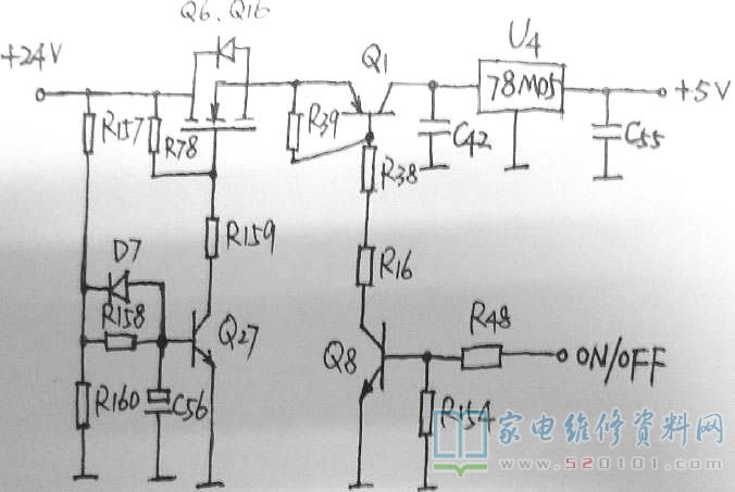 故障检修:根据故障现象,基本判断故障范围在OZ964及其外围。首先测量ZO964的供电脚5脚,发现电压很低,几乎为0V,顺着5脚查看电路板,发现OZ964的供电是由三端稳压U4(78M05)提供,如图所示。测Q1发射极电压20V正常,集电极无电压输出,测Q8集电极电压0.2V,说明Q8已导通,背光控制电平已经送到Q8的基极,故障元件在Q1、R39、R38、R16,查得Q1开路,更换一只PNP电流大于100mA的三极管开机,发现U4(78M05)炸裂,说明其负载电流过大或本身损坏。断电测78M05输出脚对地电阻500欧左右,未见短路,更换一只新的78M05后开机,灯管点亮,故障排除。
