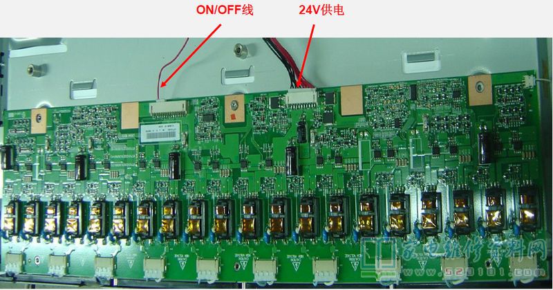 找一块灯管完好的AU37寸旧液晶屏,再找一块ON37A的电源板,在电源板插座P802上的5V-Standby和Vcc-On之间并接一只20K电阻,并将Vcc-On引出一条线连接至背光板插座CN2的PIN13,作为背光控制信号,同时将电源板上的24V电源(实际输出20V)连接至背光板插座CN1上,电源板接通电源,10组灯管即能点亮。
