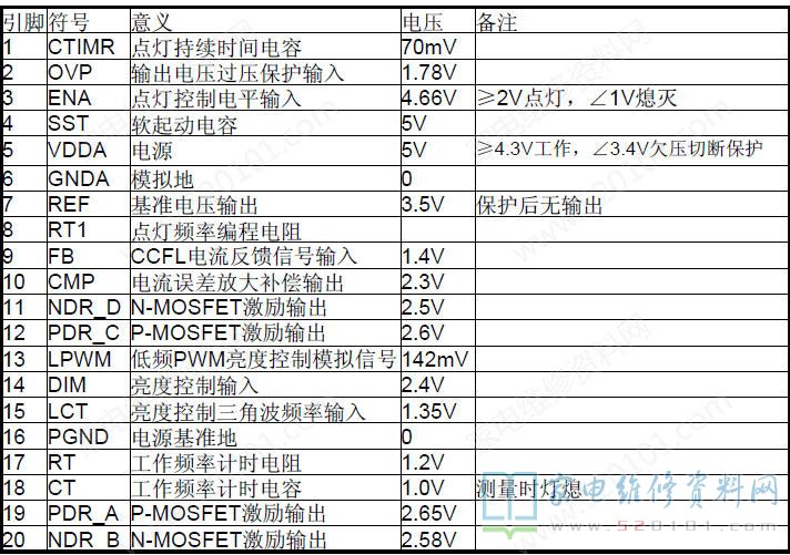 17/18脚RT/CT振荡电阻和电容:该两脚内部是背光振荡电路,振荡频率由这两脚的电阻电容决定,运行频率f由下式决定:f「KHz」=65×10000/CT「pF」×RT「K」