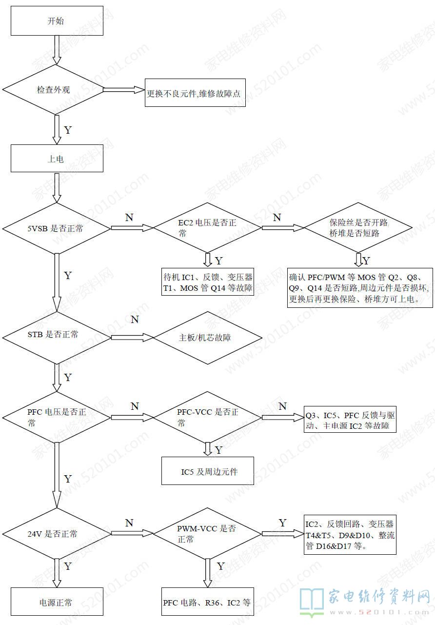 检查 IC1 的VCC 是否供电正常,稳压管Z10 是否击穿,肖特基二极管D14 是否击穿,二极管D8&D5 是否击穿,变压器T1 是否开路,反馈回路是否开路,MOS 管Q14 是否击穿;如果Q14 击穿,则R139A&R139B&R139C&R139D&Z1 必须更换,其它损坏的元件也应更换。